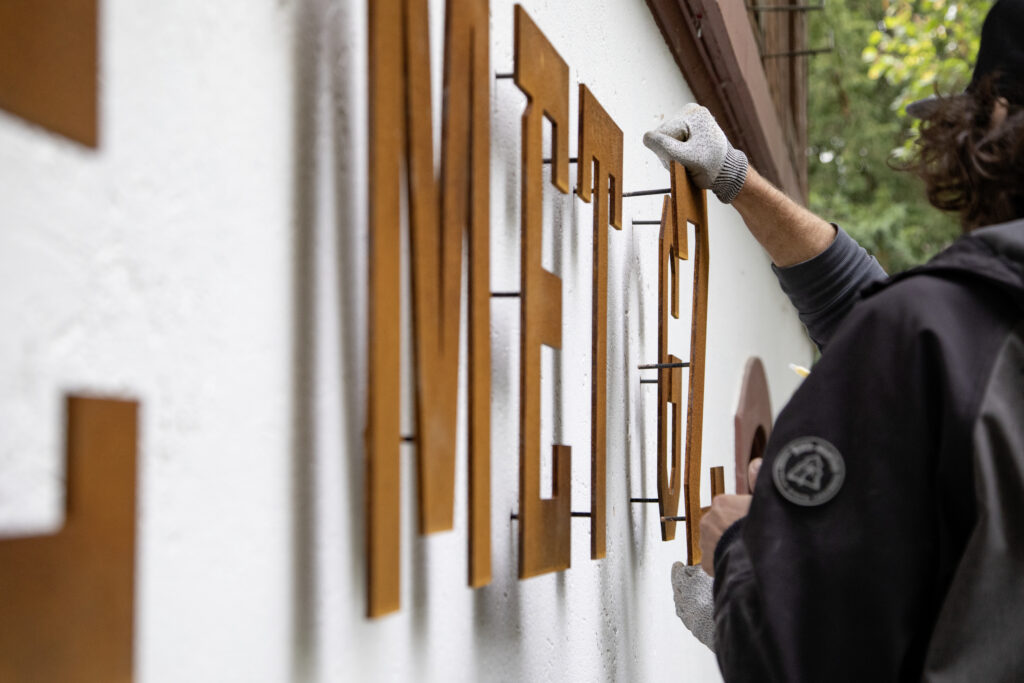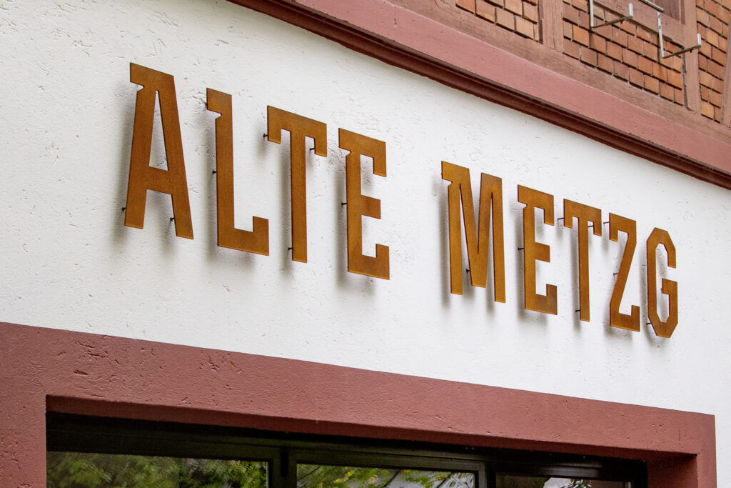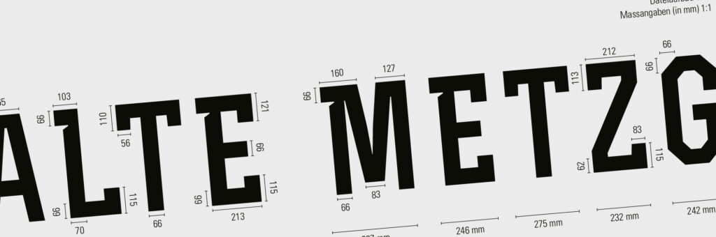 Die «Alte Metzg» ist ein historisches Gebäude im Dorfkern der Gemeinde Sissach, welches heute als Eventraum mit Galerie für Anlässe und Ausstellungen von regionalen Künstler:innen dient. Während meiner Anstellung bei KOKONEO durfte ich dem hübschen Backsteingebäude eine zur Architektur passende Aussenbeschriftung verleihen. Die konstruierte Schrift mit modernen Details nimmt die Proportionen der Fachwerkstruktur auf. Der Schriftzug wurde aus Cortenstahl gelasert und die Buchstaben so lange dem Rostprozess überlassen, bis diese die gewünschte Farbigkeit erreicht hatten.